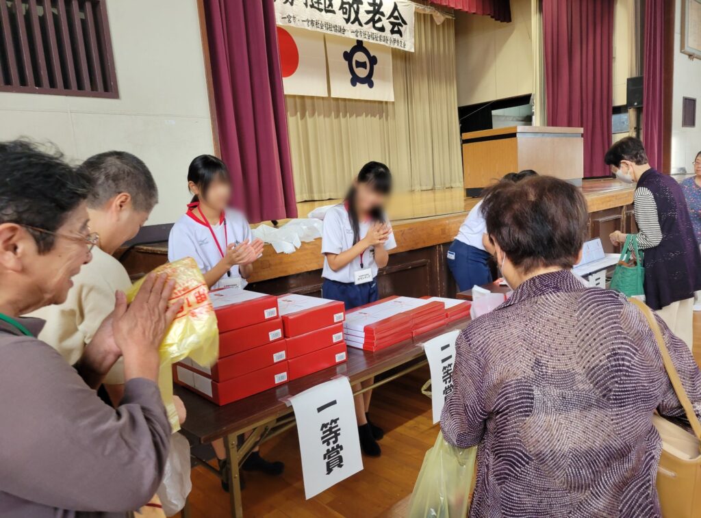 今伊勢中学校より11名の中学生が、敬老会のボランティアに参加して下さいました。椅子の準備&片付け、商品の袋詰め、受付、靴袋配布、席への案内、抽選会の商品渡しなど、お手伝いして頂きありがとうございました。