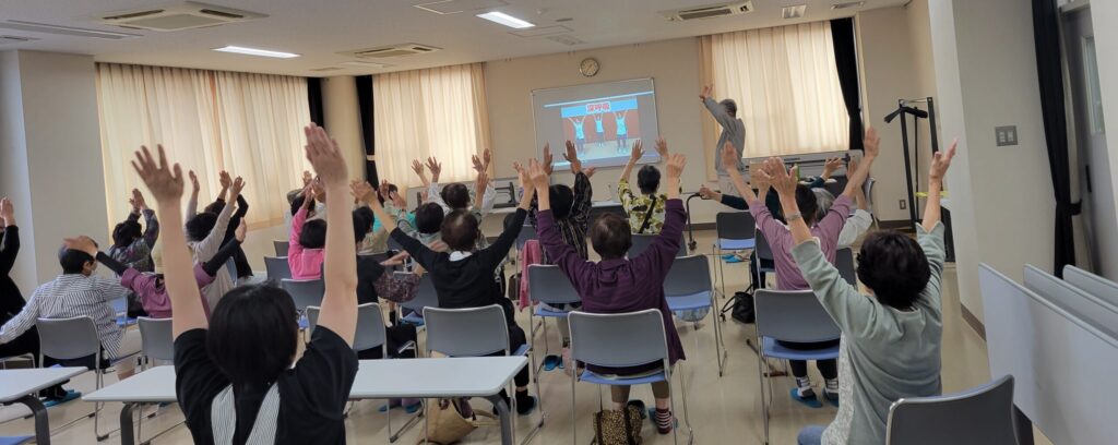●一宮市今伊勢町にある『ニッケあすも一宮』の平田さんに来ていただき、毎度お馴染み☆スクリーンに映し出された映像に合わせて体を動かした体操や脳トレ体操をしました。