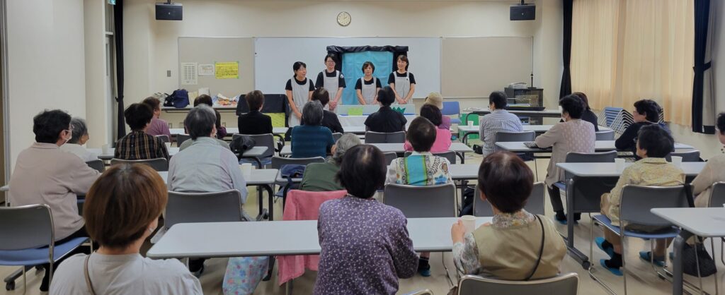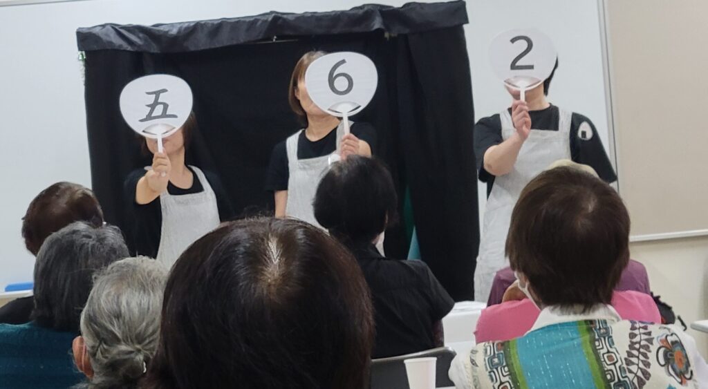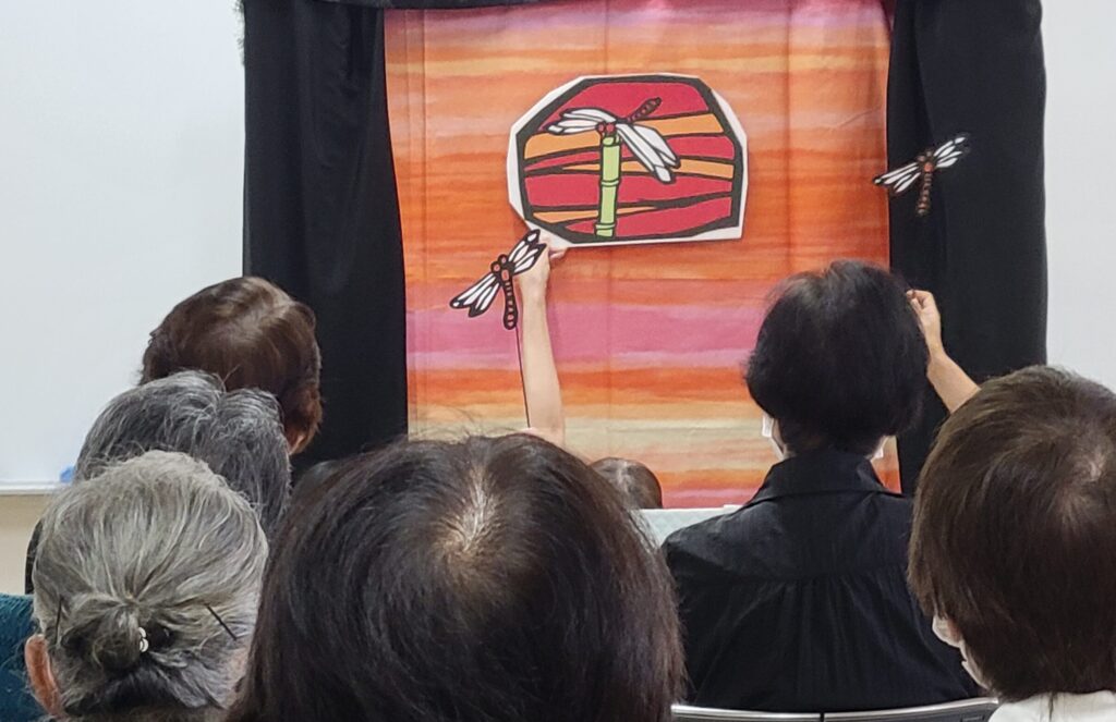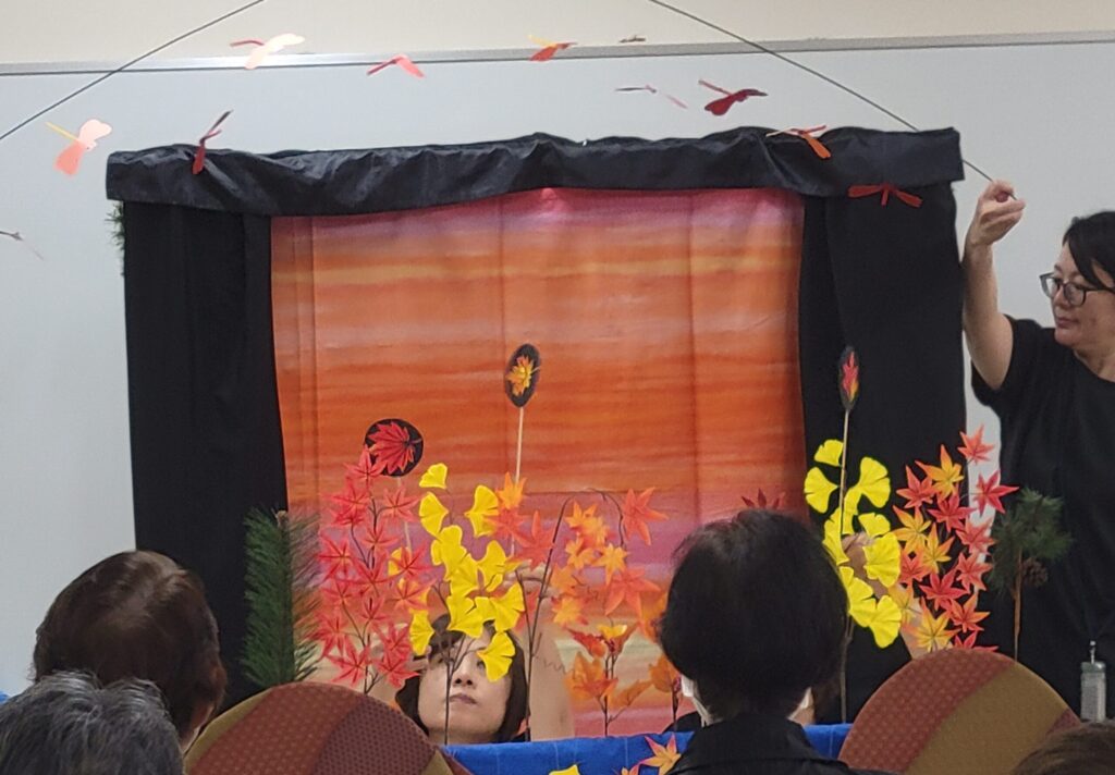オープニング♪野に咲く花のように/秋の曲♪赤とんぼ♪月♪もみじ/読み聞かせ♪チリンのすず/パネルシアター♪パネル寄せ 昔話について/赤とんぼの歌を歌いましょう/脳トレ体操♪早口言葉♪うちわで計算しましょう/てんとう虫のサンバ♪